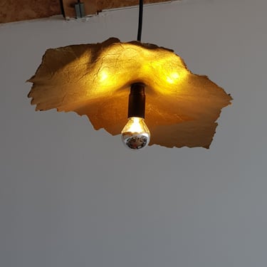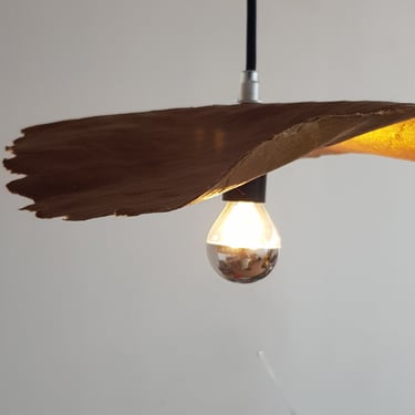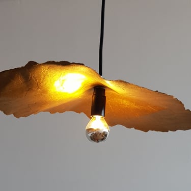 Conçue en papier kraft déchiré à la main, chaque feuille révèle la texture brute et l’authenticité de la matière, jouant avec la lumière pour créer des reflets subtils et changeants. Ce luminaire aérien semble flotter dans l’espace, ajoutant une touche poétique et organique à votre intérieur.