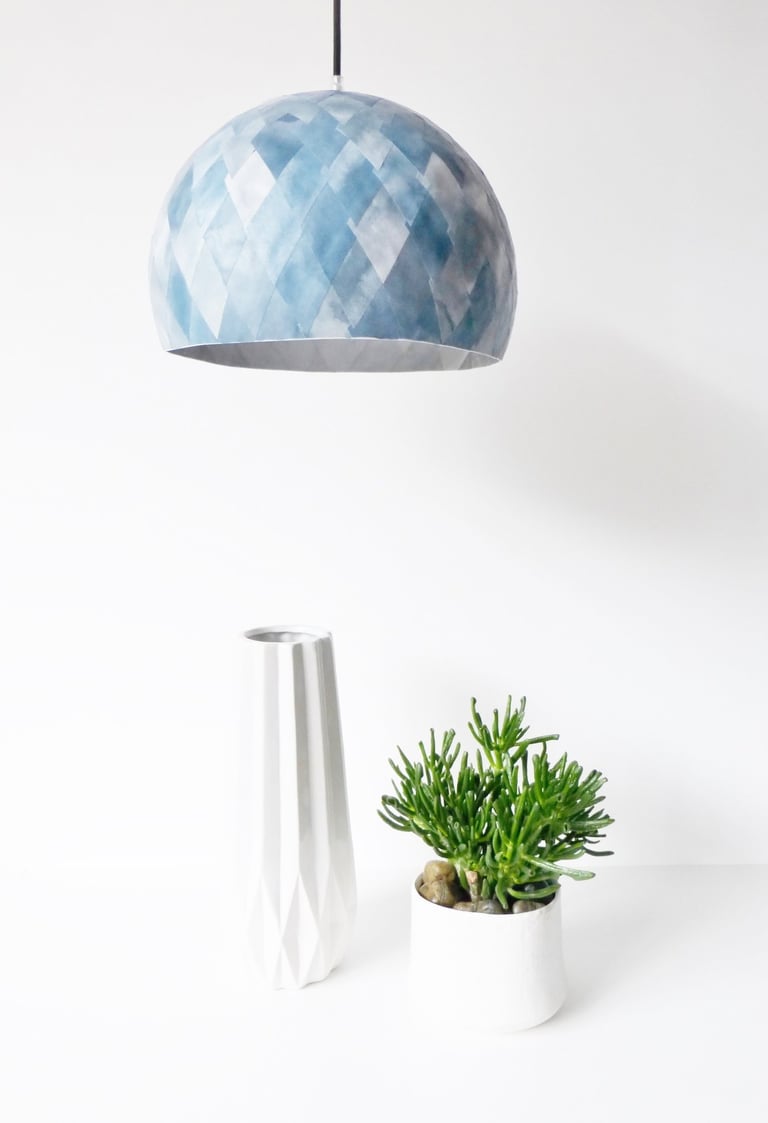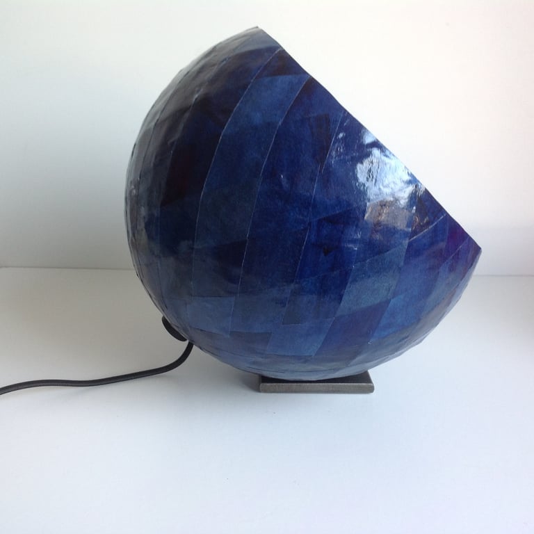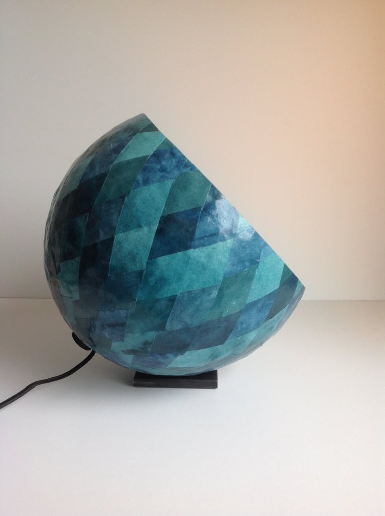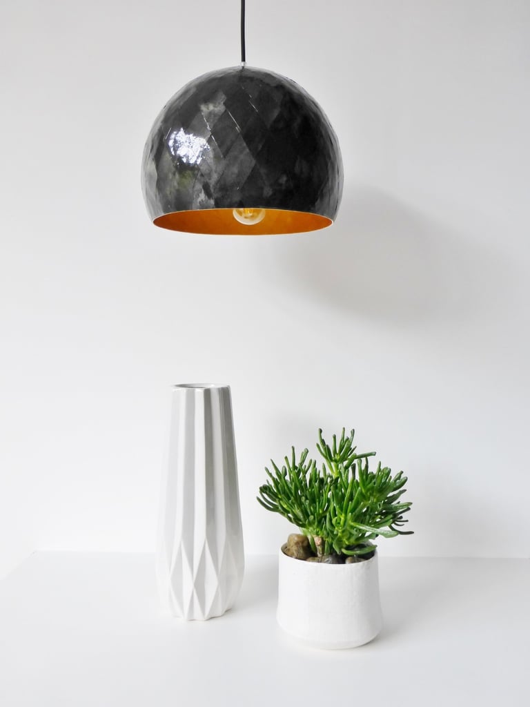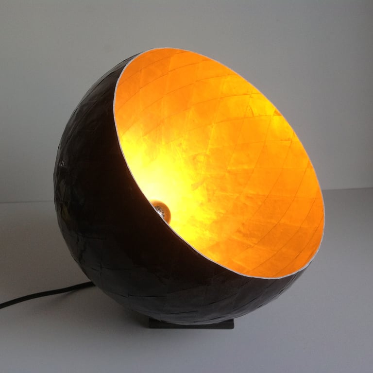Chaque pièce est façonnée à la main à partir de papier kraft recyclé, puis sublimée par des couches de vernis, offrant une surface lisse et éclatante qui capte la lumière avec finesse.